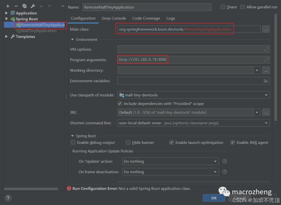 - 添加一个启动配置,修改启动类为org.springframework.boot.devtools.RemoteSpringApplication,配置信息具体如下;