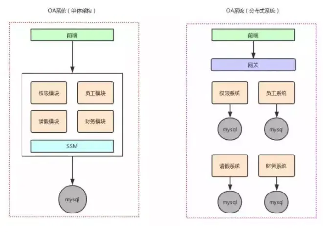举个例子,假设原来你做了一个OA系统,里面包含了权限模块、员工模块、请假模块、财务模块,一个工程,里面包含了一堆模块,模块与模块之间会互相去调用,1台机器部署。