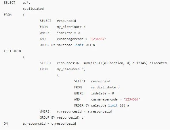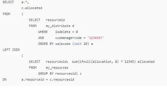 那么该语句还存在其它问题吗?不难看出子查询 c 是全表聚合查询,在表数量特别大的情况下会导致整个语句的性能下降。