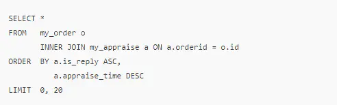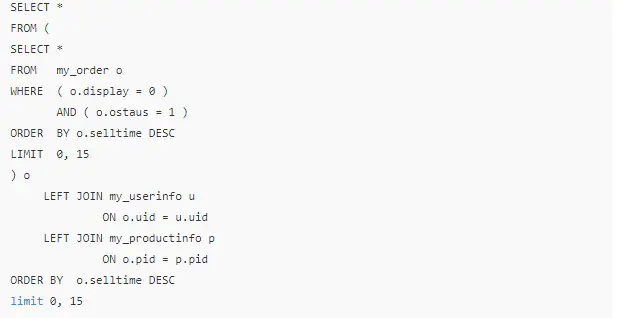 由于最后 WHERE 条件以及排序均针对最左主表,因此可以先对 my_order 排序提前缩小数据量再做左连接。SQL 重写后如下,执行时间缩小为1毫秒左右。
