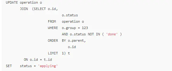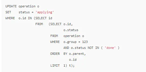 比如下面 UPDATE 语句,MySQL 实际执行的是循环/嵌套子查询(DEPENDENT SUBQUERY),其执行时间可想而知。