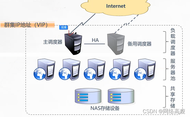 访问整个群集系统的唯一入口,对外使用所有服务器共有的VIP地址,也称为群集IP地址。通常会配置主、备两台调度器实现热备份,当主调度器失效以后能够平滑替换至备用调度器,确保高可用性。负载均衡层