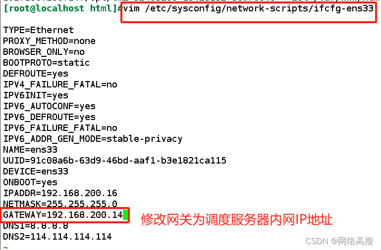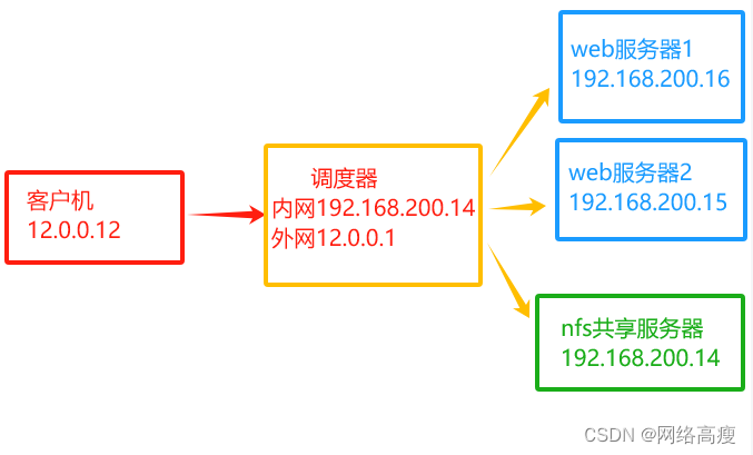 负载调度器:内网关 lvs,ens33:192.168.200.14,外网关 ens36:12.0.0.1