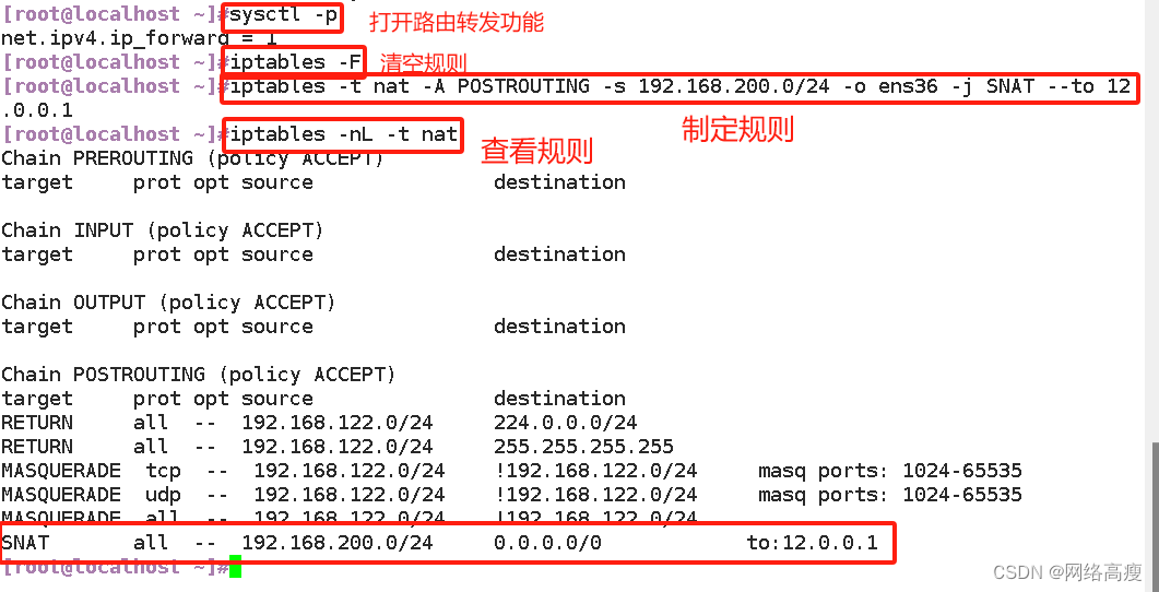 iptables -t nat -A POSTROUTING -s 192.168.200.0/24 -o ens36 -j SNAT --to 12.0.0.1