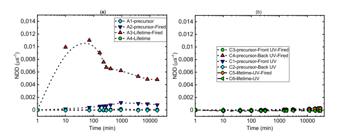 60℃下的NDD下(a)A组样品在随退火时间的变化;(b)C组样品UV-A 暴露时间的变化
