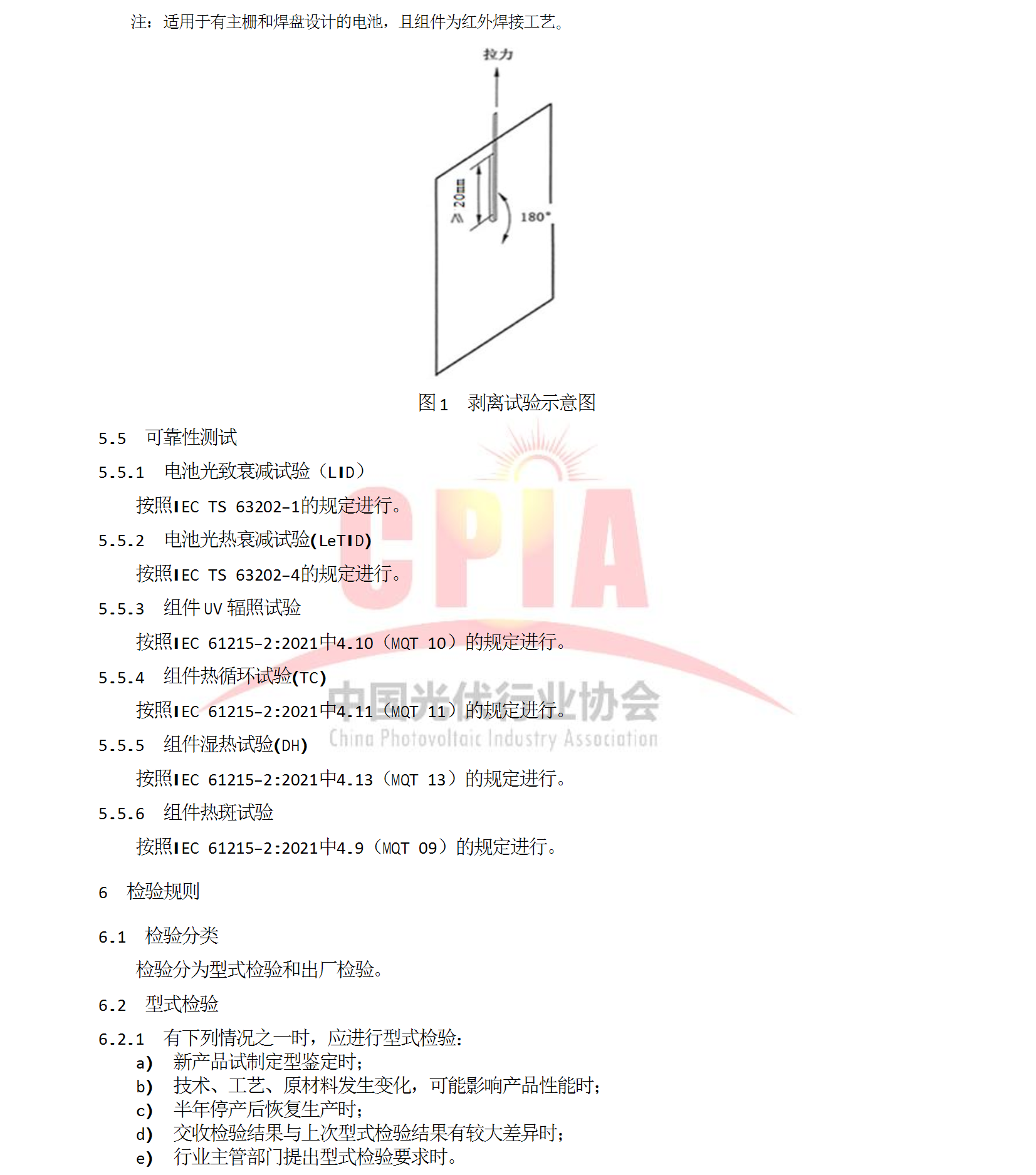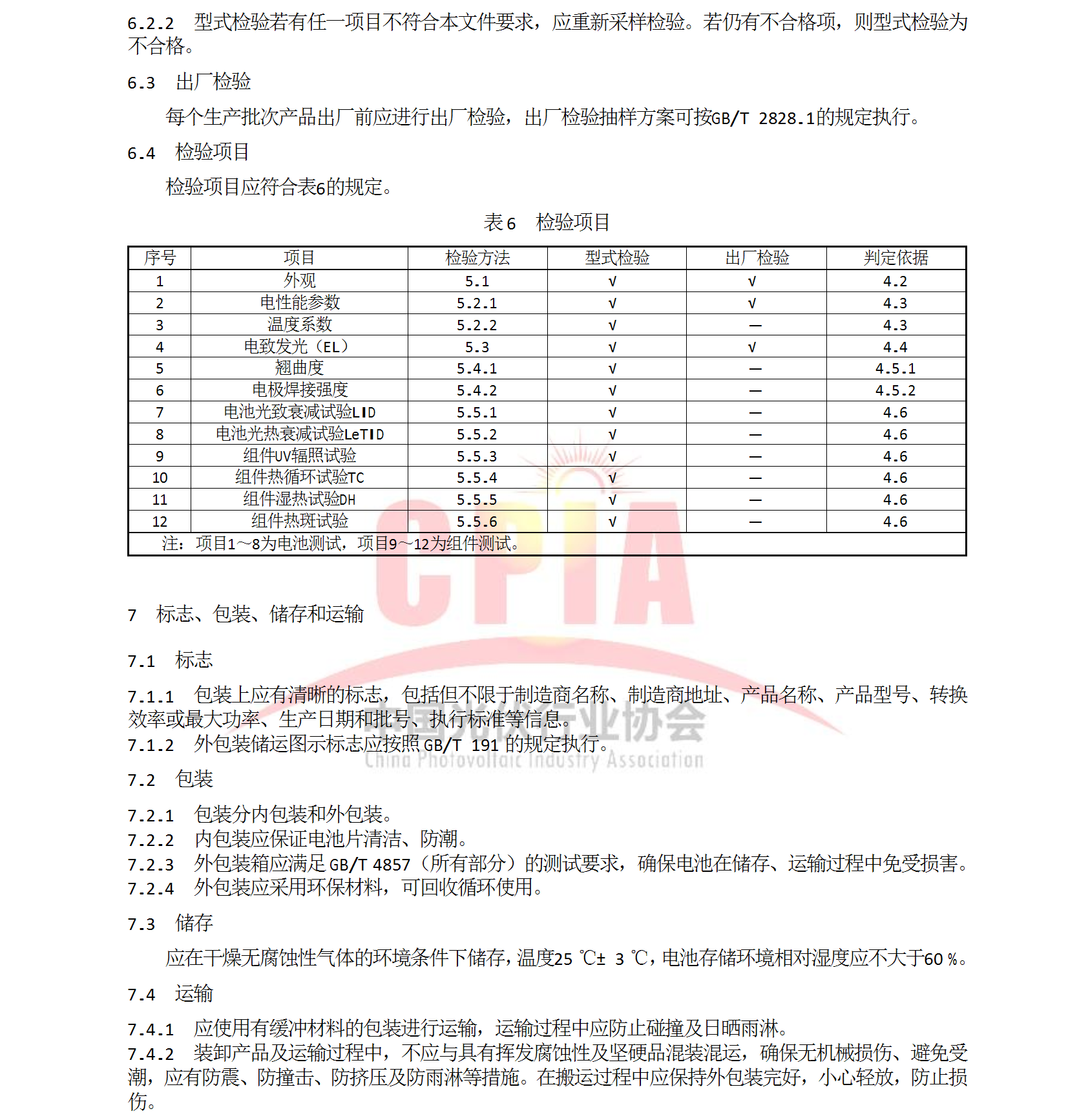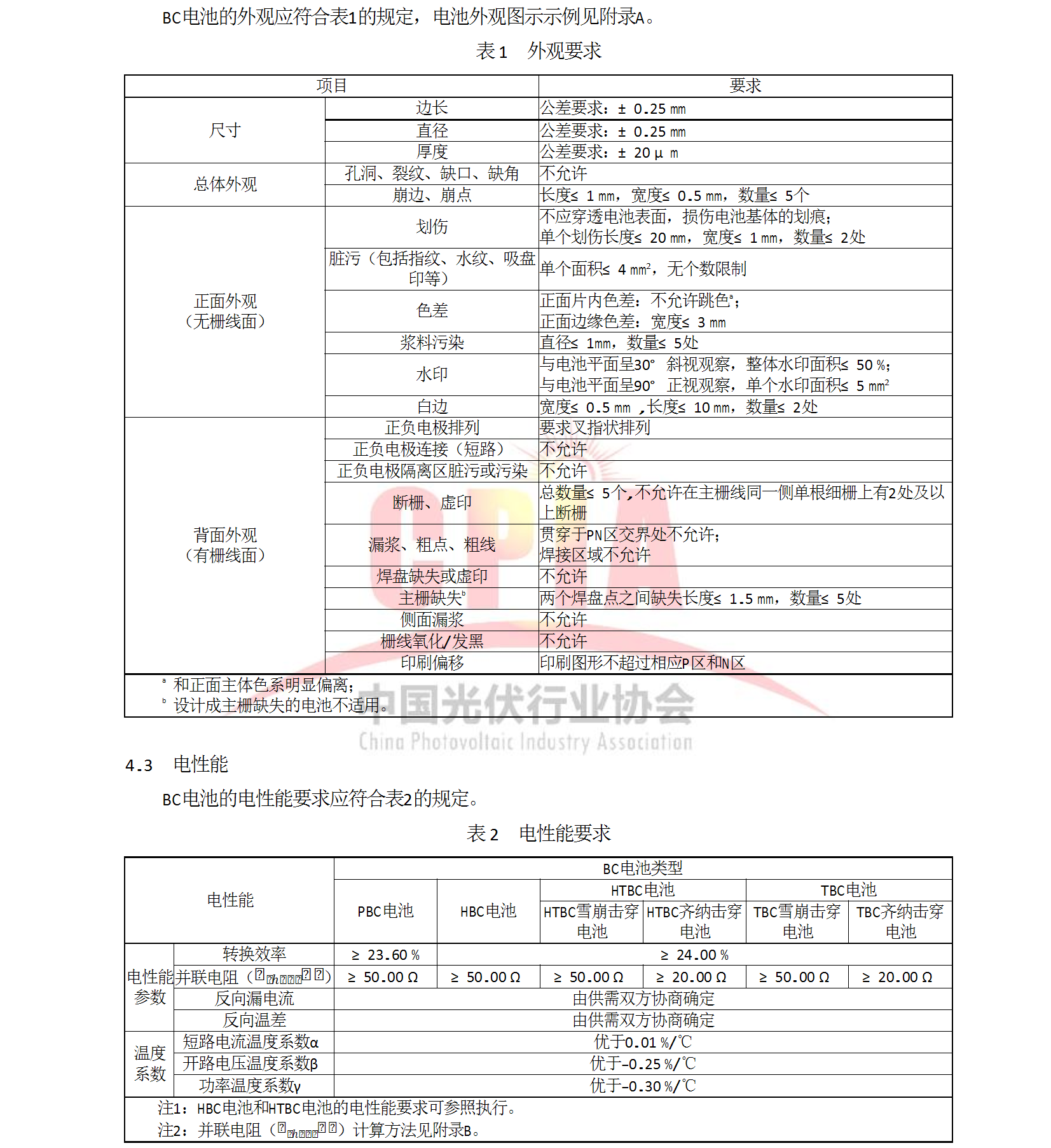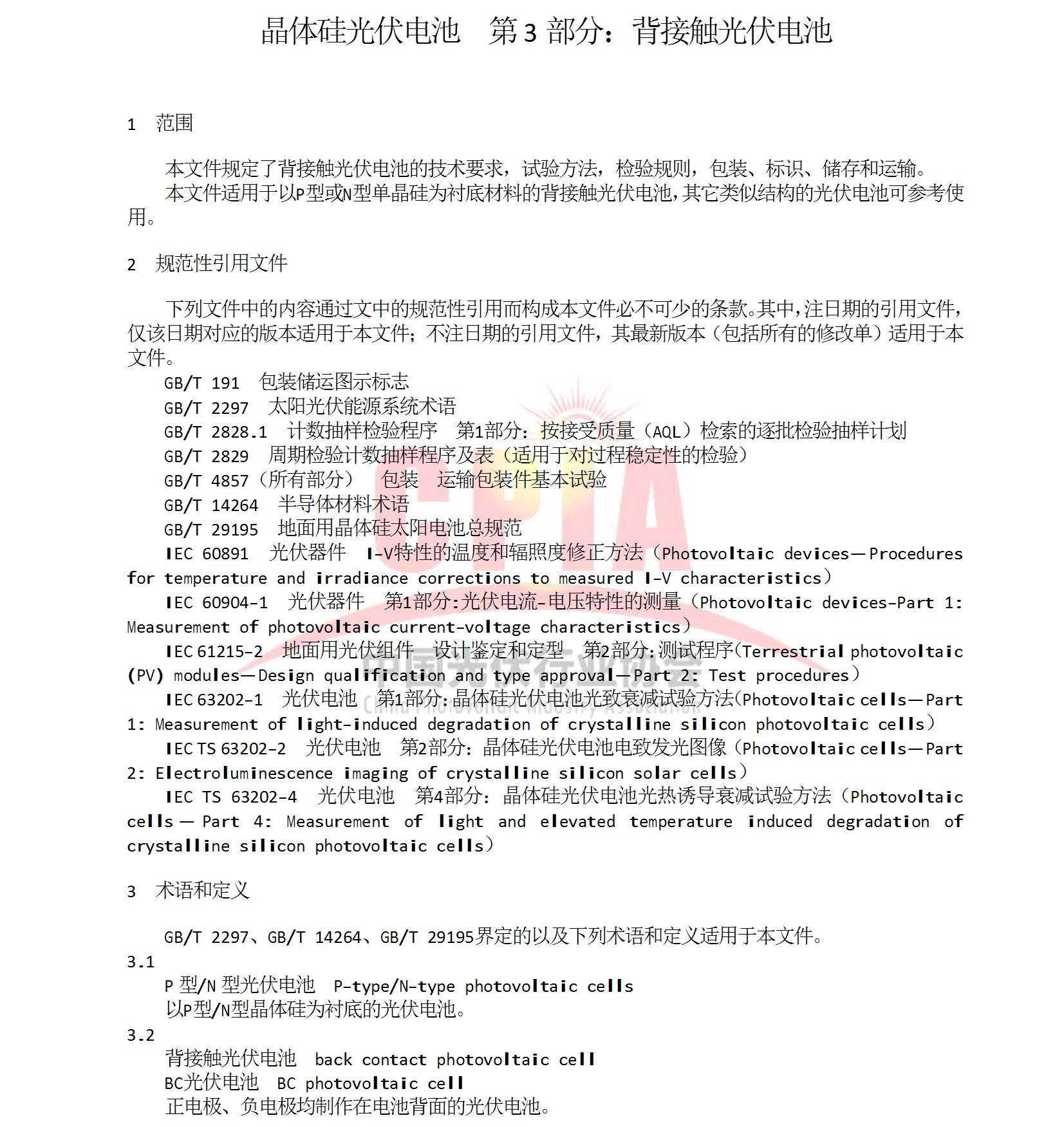 T/CPIA 0055.3—2025《晶体硅光伏电池 第3部分:背接触光伏电池》是由中国光伏行业协会发布的团体标准,适用于以P型或N型单晶硅为衬底的背接触(BC)光伏电池。该标准规定了BC电池的分类(包括PBC、HBC、HTBC、TBC等类型)、外观、电性能、电致发光(EL)、力学性能及可靠性等方面的技术要求,并详细给出了相应的试验方法、检验规则以及标志、包装、储存和运输要求。标准旨在统一背接触光伏电池的生产与检验流程,确保产品质量与性能可靠,推动光伏行业技术进步和规范化发展。