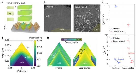 最终,激光处理使p型接触的电阻率降低了一个数量级。当然,导电性的提升也伴随着钝化质量的轻微下降,这主要源于高温对硅-氢键的破坏。因此,需要在工艺中精细平衡激光参数与非晶硅层性质。