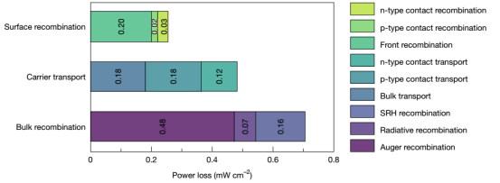 - 总体而言,三分之二的损耗来自复合,另外三分之一来自载流子传输电阻。其中,p型接触的电阻损耗比n型高出50%,是未来需要重点优化的方向。