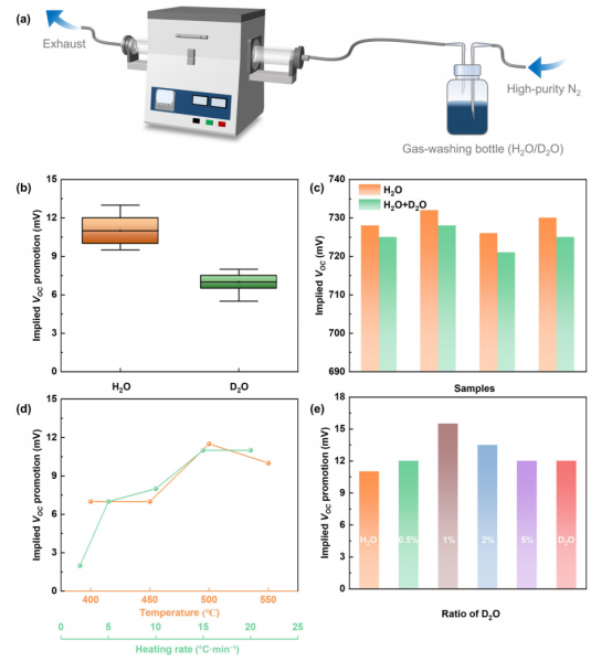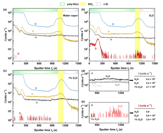 实验采用n型c-Si衬底,制备对称双面TOPCon结构(poly-Si(n)/SiOₓ/c-Si(n)/SiOₓ/poly-Si(n))。关键步骤包括热生长超薄SiOₓ层、沉积磷掺杂非晶硅、高温晶化形成多晶硅,最后进行气氛退火。退火在氮气保护下进行,通过鼓泡法分别引入水蒸气(H₂O)、氘水(D₂O)或两者混合蒸气。系统优化退火温度、时间、升温速率及气体比例。