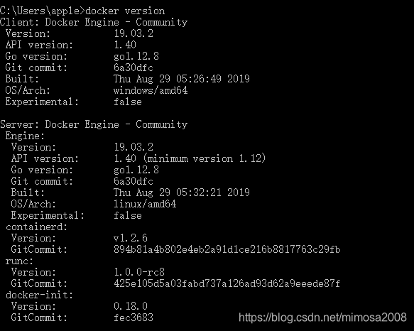 1.在桌面找到Docker for Windows快捷方式,双击启动即可!启动成功后托盘处会有一个小鲸鱼的图标。打开命令行输入命令:docker version可以查看当前docker版本号,如图: