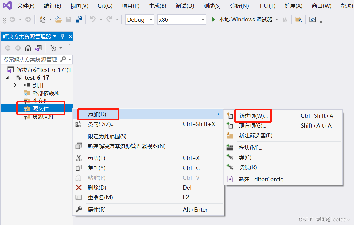 项目创建成功后,接着创建源文件。在“资源管理器”栏中右击“源文件”,依次点击“添加”、“新建项”。