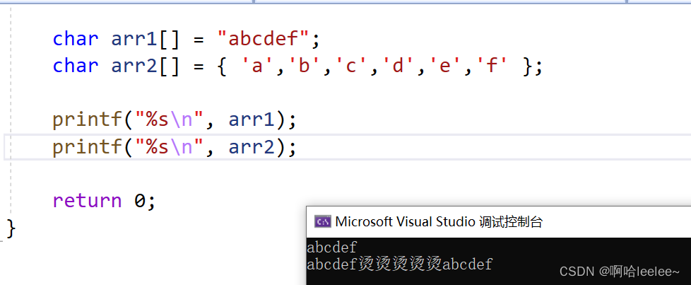 int main() { char arr1[] = "abcdef"; char arr2[] = { 'a','b','c','d','e','f' }; printf("%s", arr1); printf("%s", arr2); return 0; }