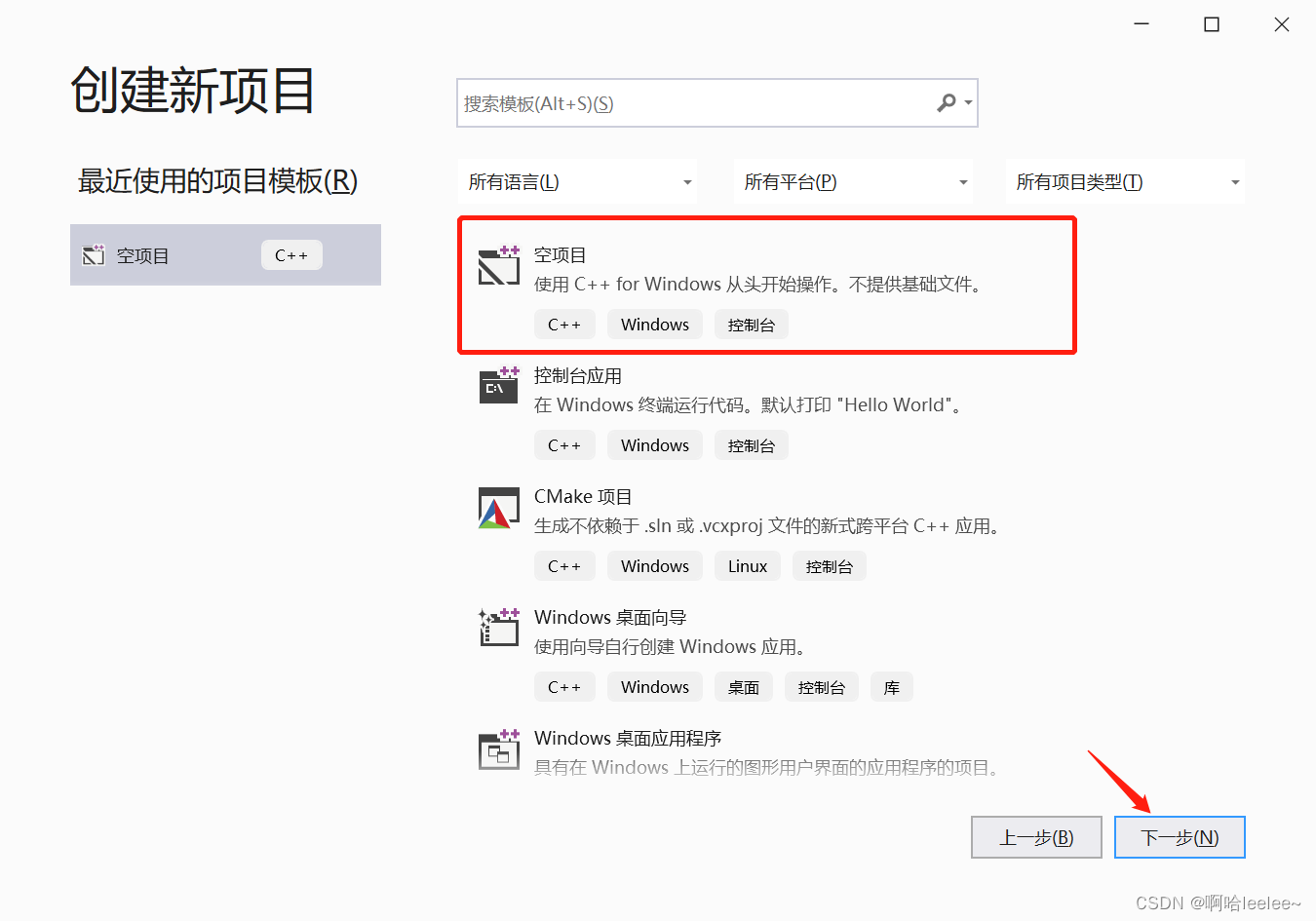 然后选中“空项目”,点击“下一步”。