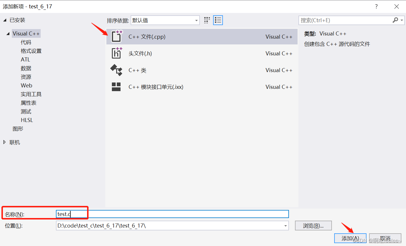 点击“c++文件”,因为我们编写c语言,所以文件名称后缀改为“.c”,最后点击“添加”。