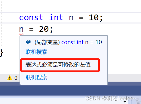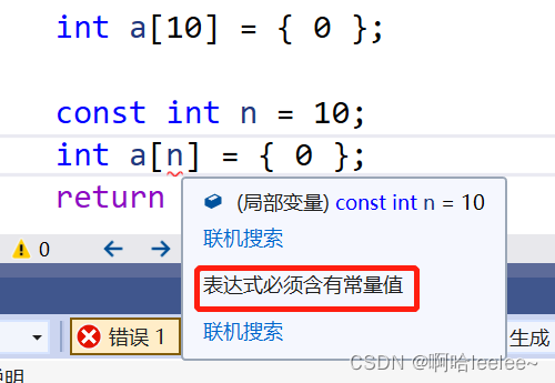 const修饰的常变量:被const修饰的变量具有常属性,值不能再被改变,但本质上仍是变量。如图所示,变量n被const修饰后不能再被改变,具有常属性。