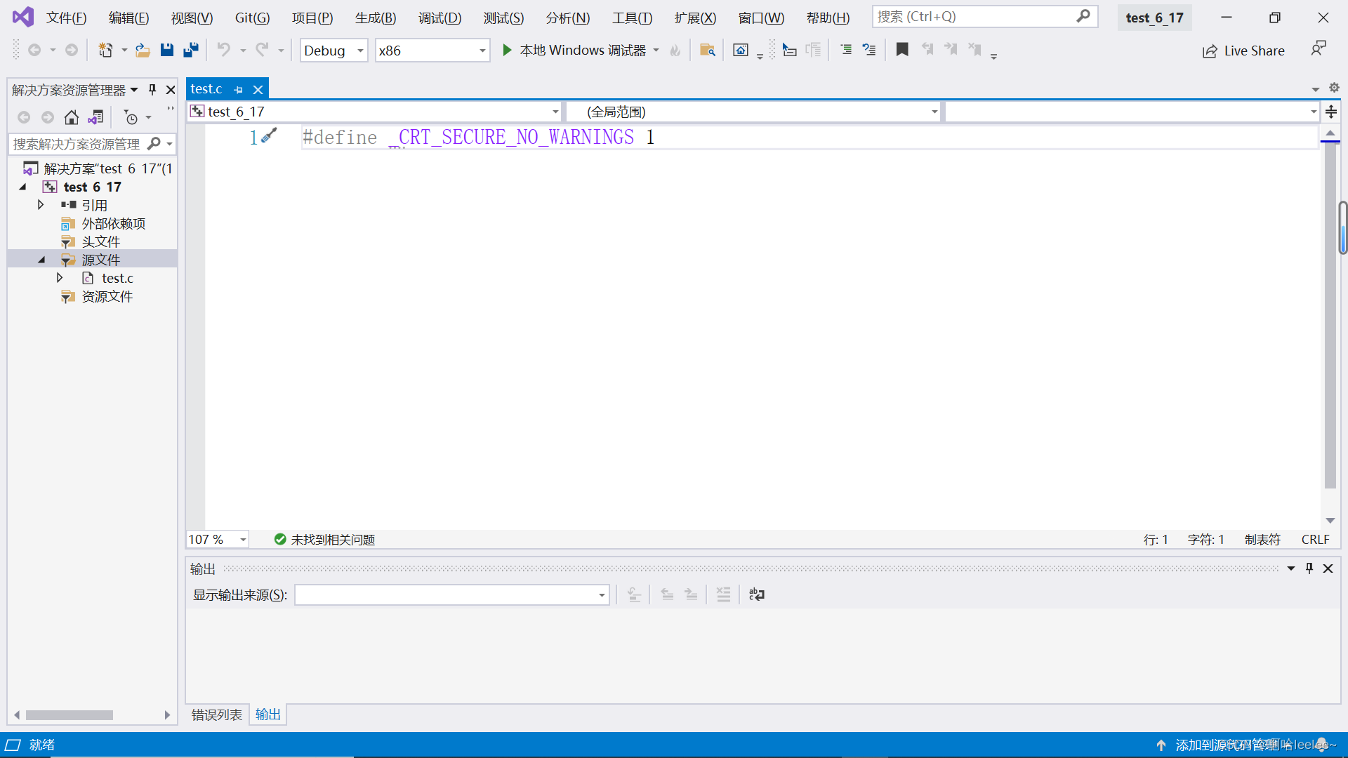 创建源文件之后的界面如下所示,现在就可以在空白区域编写c语言代码啦。