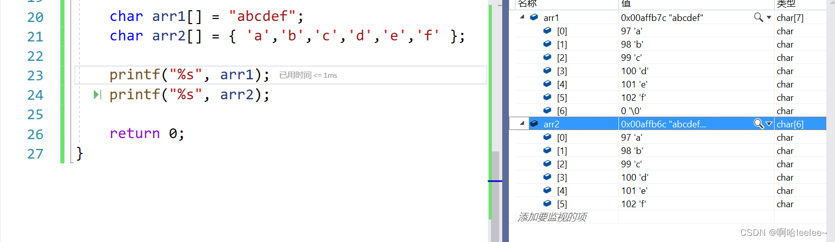 在调试中可以看出,数组arr1中包含\0,而数组arr2中不包含\0。