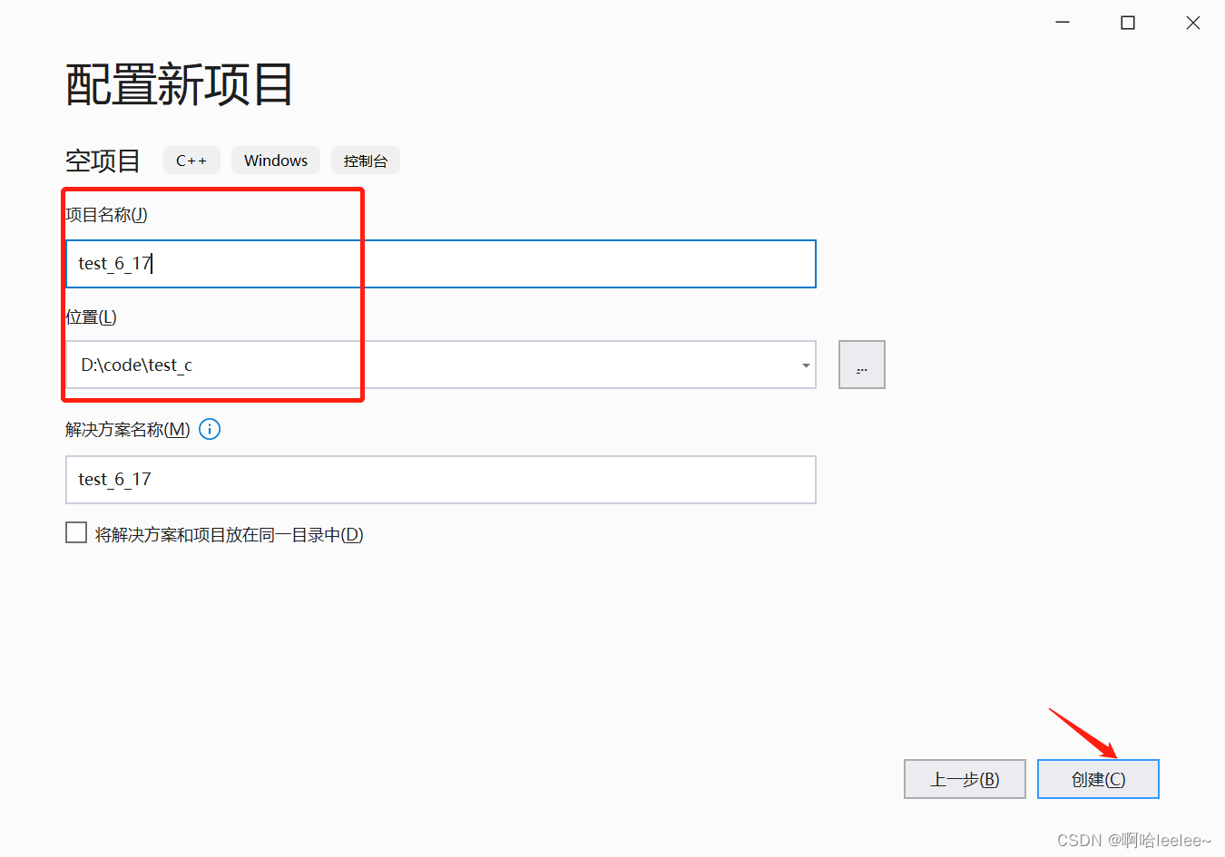可以根据自己需求修改“项目名称”和“位置”,“项目名称”最好不要包含汉语、特殊字符、空格等。修改完后点击“创建”。