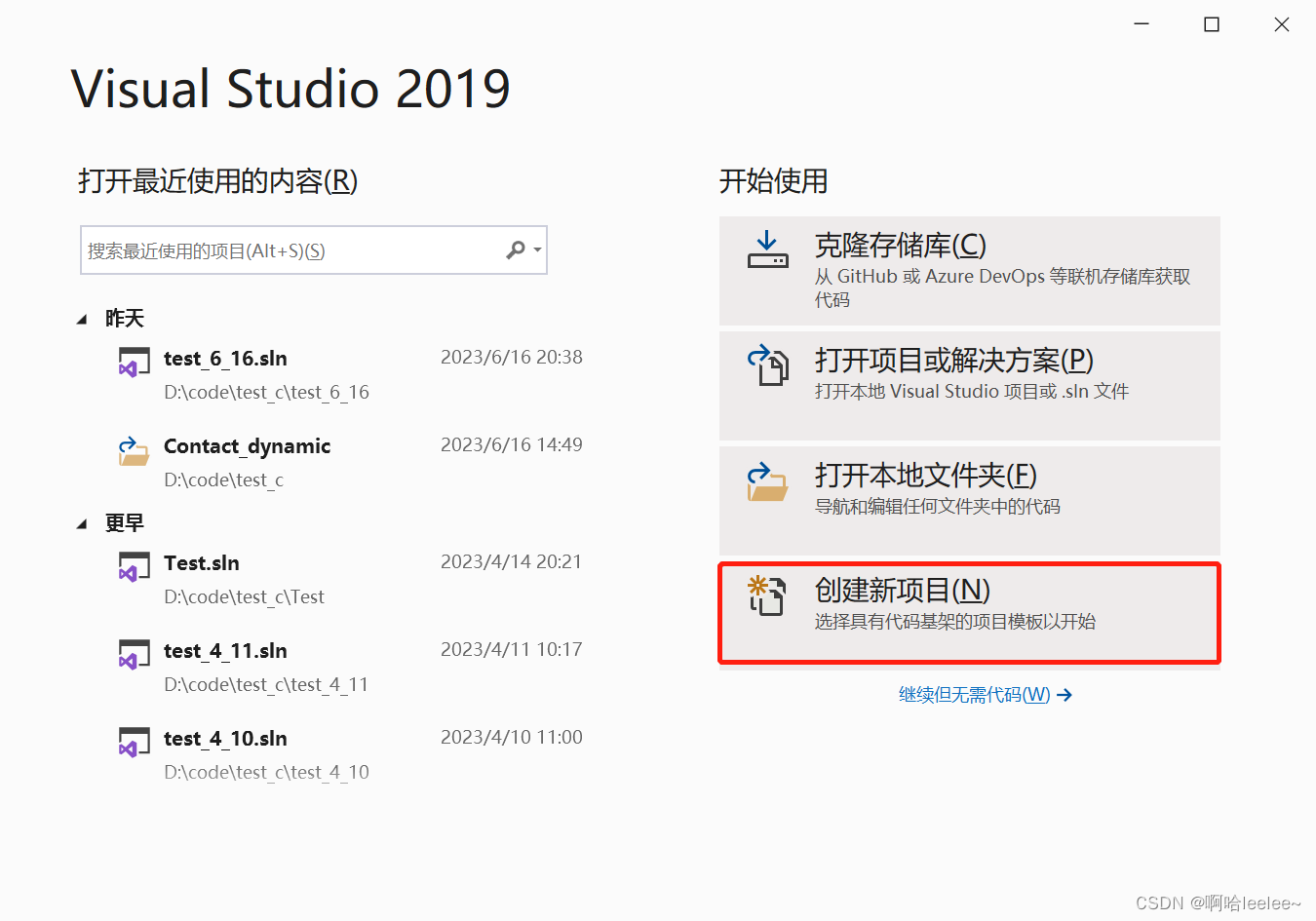首先打开VS2019编译器,点击“创建新项目”。