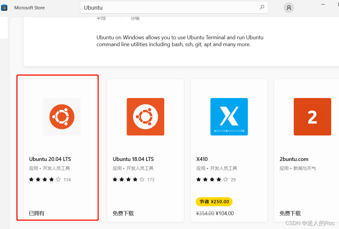 打开微软应用商店,搜索 Ubuntu,在列表中选择最新的长期支持版本 20.04 LTS 并安装。