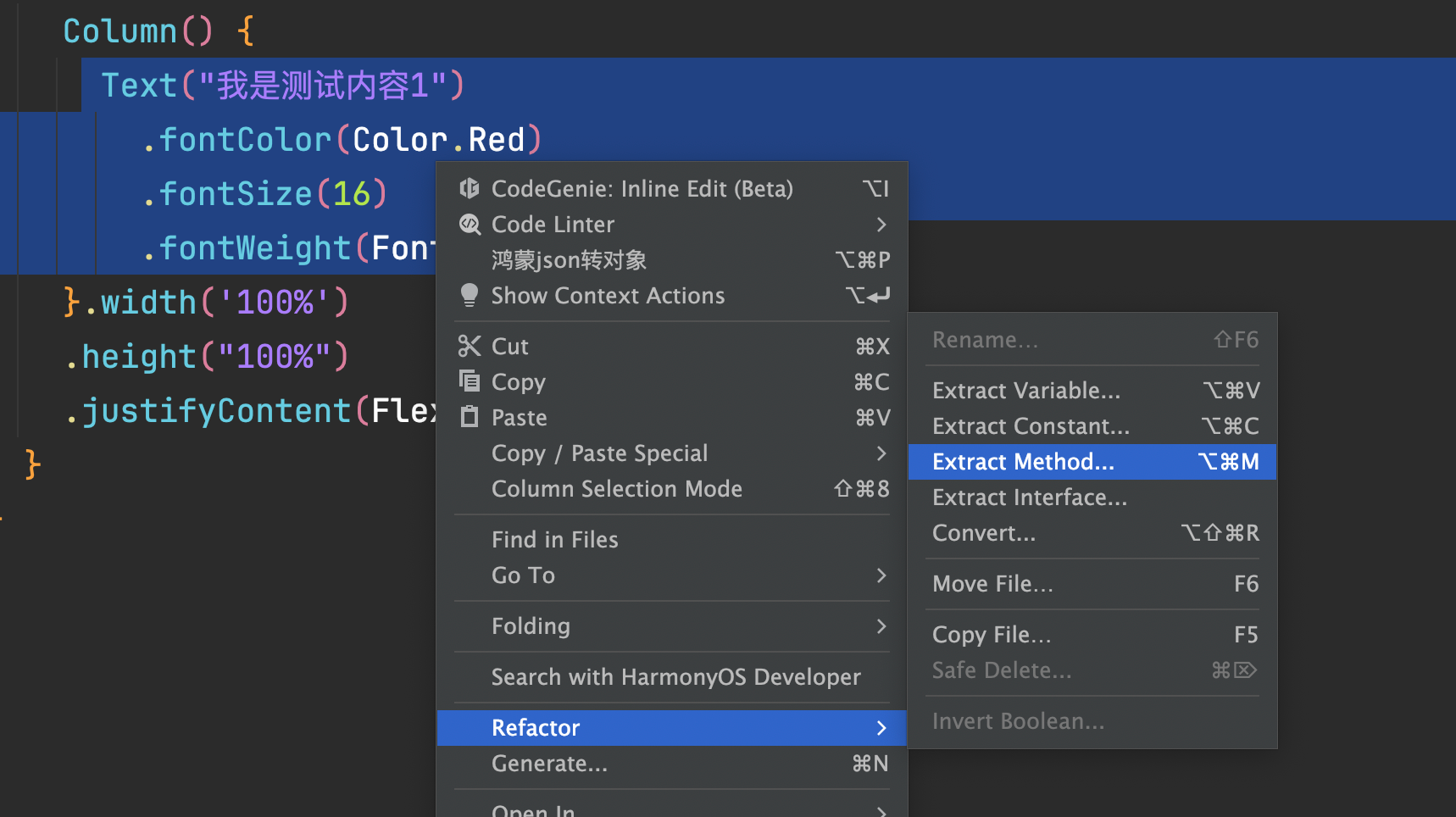 有这样的一个场景,当你初始写UI的时候,没有考虑到后面的代码复用,想要把一段重复的组件属性进行抽成一个方法?该如何快速的执行?再举一个常见的场景,一个函数,你写了很多的代码,想要把一部分代码,快速的抽成一个单独的函数,用于简化当前的代码逻辑,如何快速的实现?可能很多老铁会第一时间想到,把代码复制出来呗,这有什么难的?虽然手动复制出来可以实现,但是未免太浪费时间了,本篇文章就告诉大家一个便捷的方式来实现,那就是DevEcoStudio中的代码提取。
