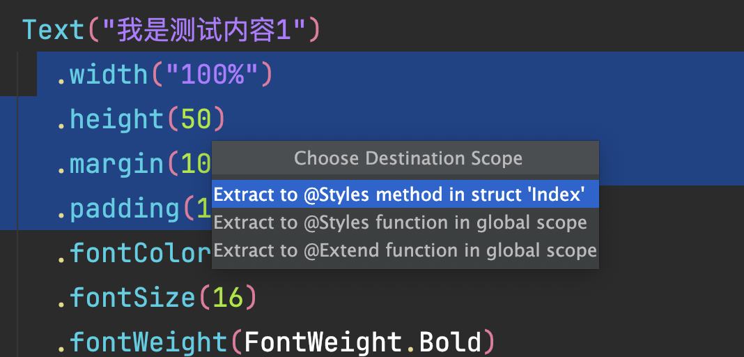很简单,只需要选中你要抽取的属性,右键选择Refactor,然后选择Extract Method...即可,它便会自动抽成一个扩展组件样式函数。