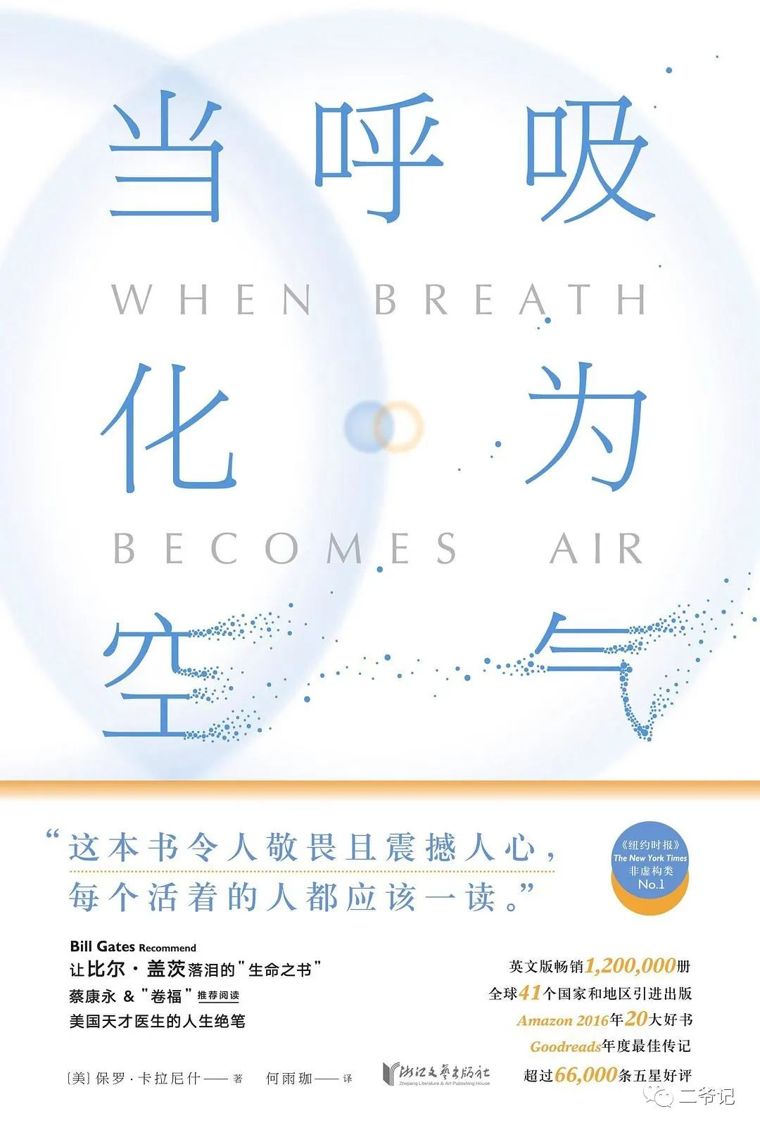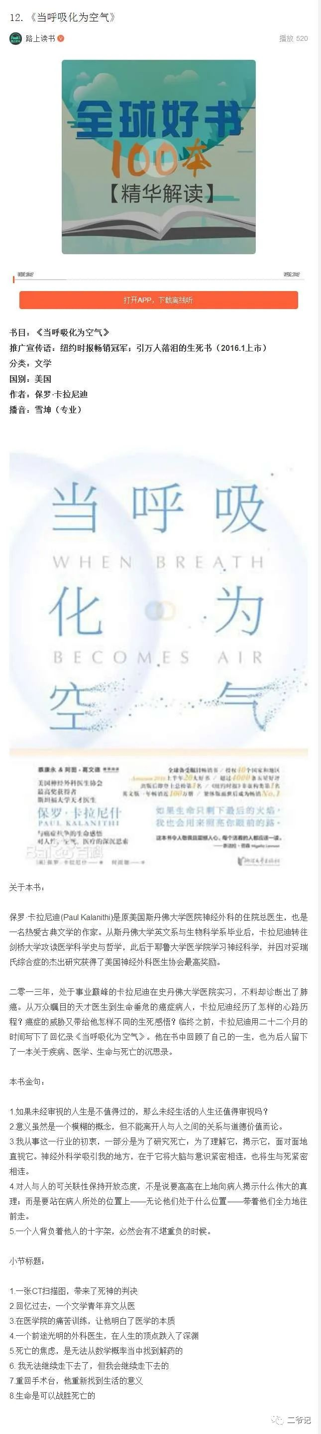 当呼吸化为空气,一本生前回忆录,讲述了作者卡拉尼迪一生,患癌症直面死亡,探索生命意义的真谛。