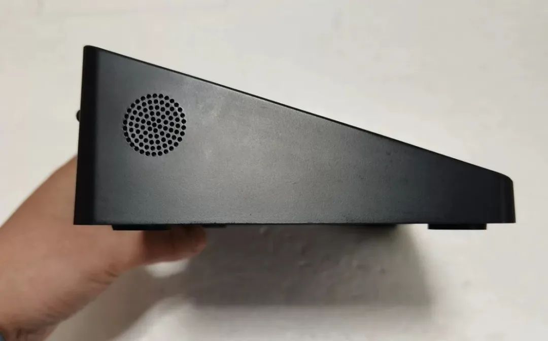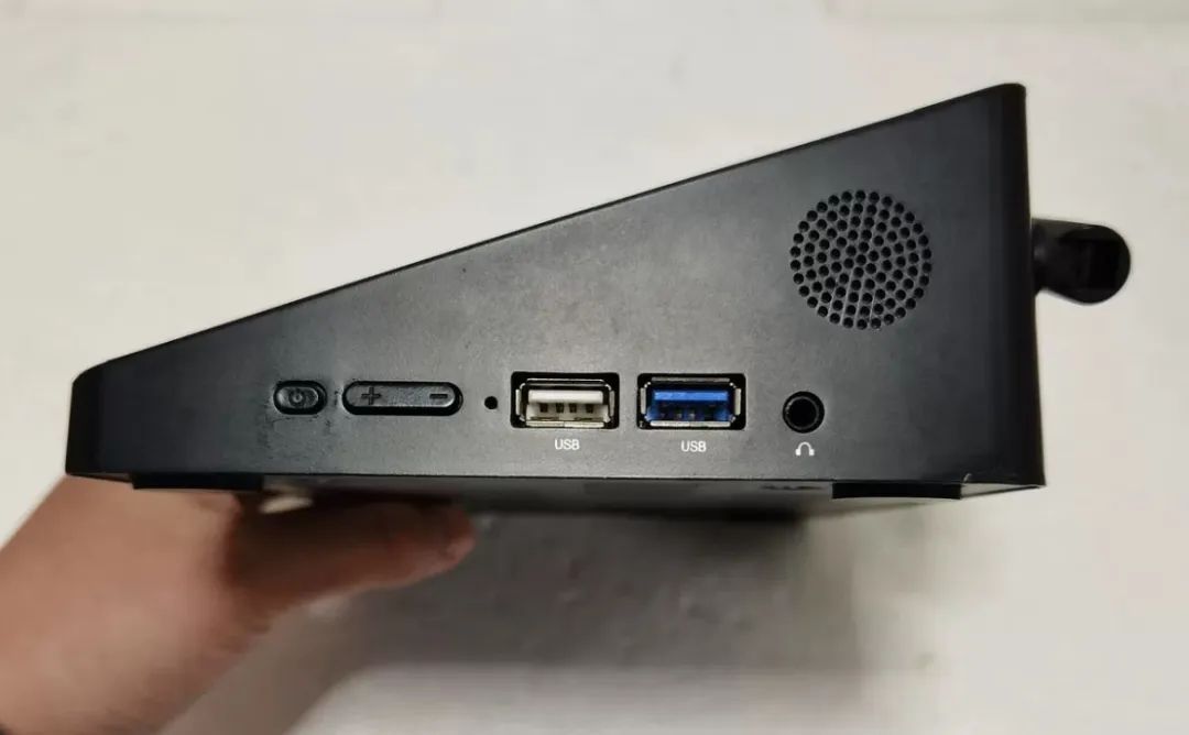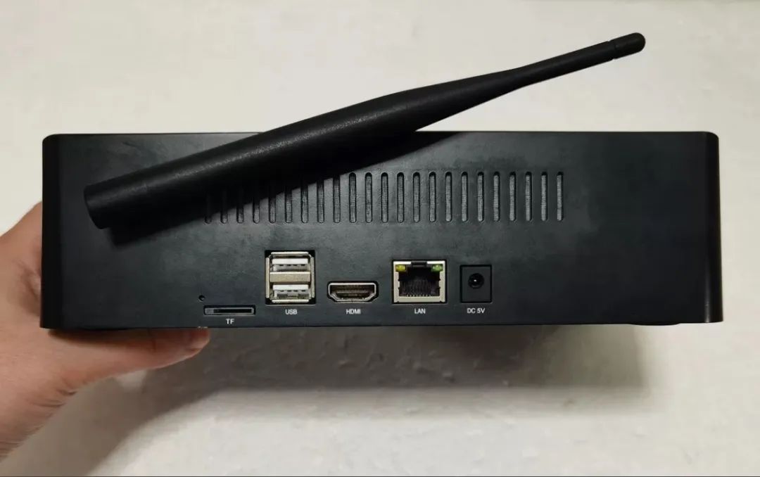 小主机接口方面,侧面接口包括开机即音量按键,1个耳机插孔,1个usb2.0和1个usb3.0接口,还有喇叭孔位。而后部则集中了大部分接口,包括TF读卡器插孔,2个usb2.0接口,1个HDMI接口,一个千兆网口以及一个DC 5V供电插孔,小主机是没有内置电池的,这一点对垃圾佬捡漏友好。