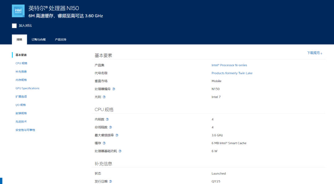 配置参数方面,其搭载的是全新12代新酷睿N150处理器,采用4核4线程设计,最高睿频3.6GHz,TDP功耗仅6W,主要应用于廉价笔记本、迷你主机及NAS设备。办公方面,畅运行WPS/Office,Chrome多标签页(20+)无卡顿。影音娱乐方面,支持4K H265硬解码,播放高清视频CPU占用率<15%,轻度游戏,《英雄联盟》1080P低画质可达40fps。