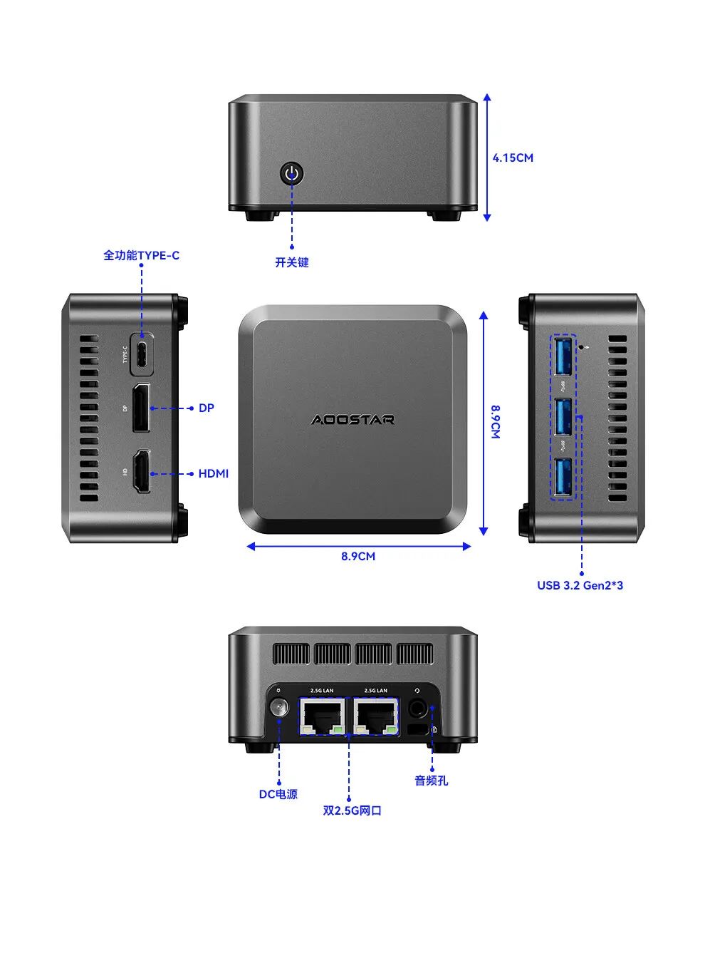 如此小巧的体积,但接口扩展方面也绝不含糊,不将就。接口遍布于机身侧面,正面仅放置了开机键位,背面则设计了DC电源接口,两个2.5G网口,一个音频插孔,一个安全锁孔。一个侧面设计了HDMI、DP、全功能TYPE-C接口,而另一侧则包含有3个usb3.2接口,算是足够使用了。如此丰富的视频输出接口设计,该款迷你主机支持三屏异显。