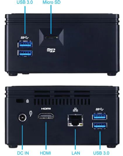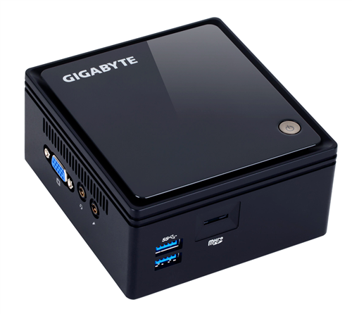 小主机是方盒子造型,看似一个手掌大小,绝对的小巧玲珑。接口设计方面,这款小主机接口布局于前后面板及侧面,开机键位位于正面,还带有技嘉的品牌文字logo。前置面板包含有2个usb3.0接口,一个TF读卡器接口,侧面包含有VGA接口,1个耳机和1个麦克风接口。后置面板则更为丰富,包含有锁孔位,电源输入接口,HDMI接口,1个千兆网口以及2个USB3.0接口。