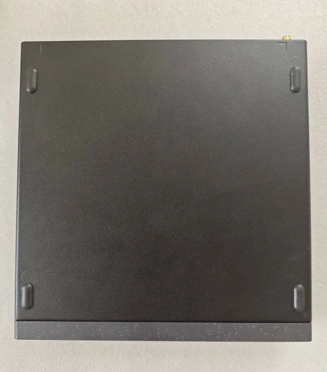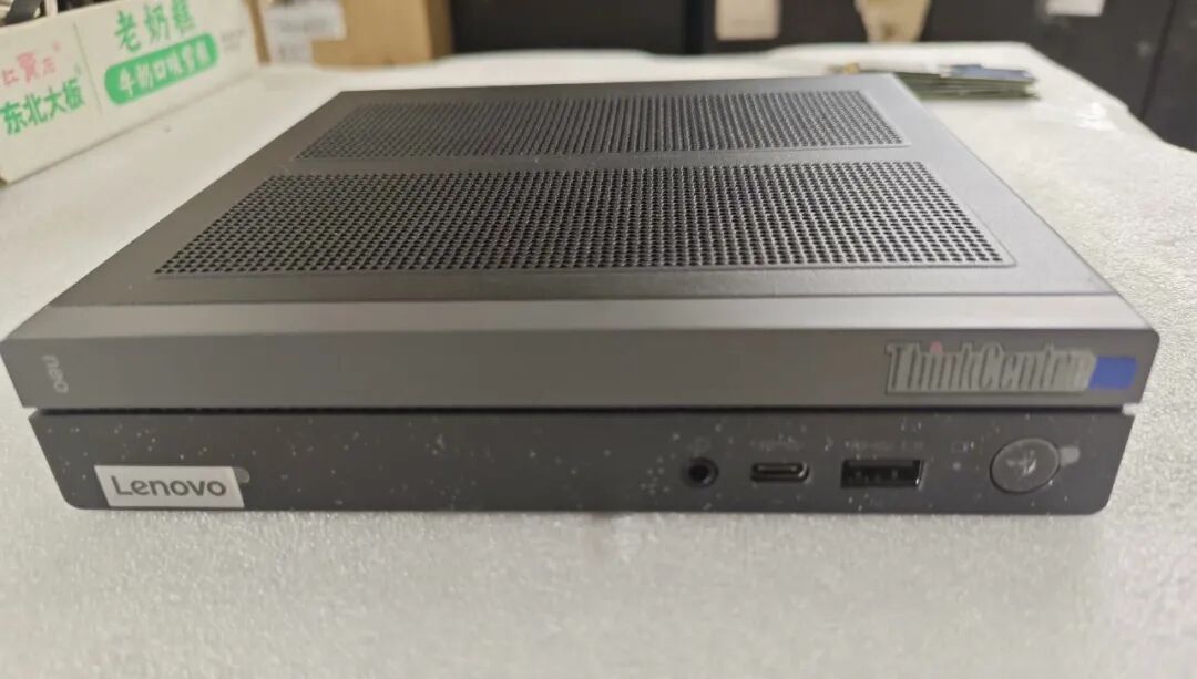 这款迷你主机就是联想 NEO 50Q gen4 迷你主机,整机非常的小巧,而且有着联想家族式系列设计风格,跟同产品线的迷你主机非常像。迷你主机前置面板带有联想的品牌logo标识,但它是属于物联网系列的产品线,侧面带有大面积的散热孔位用于给机器散热。