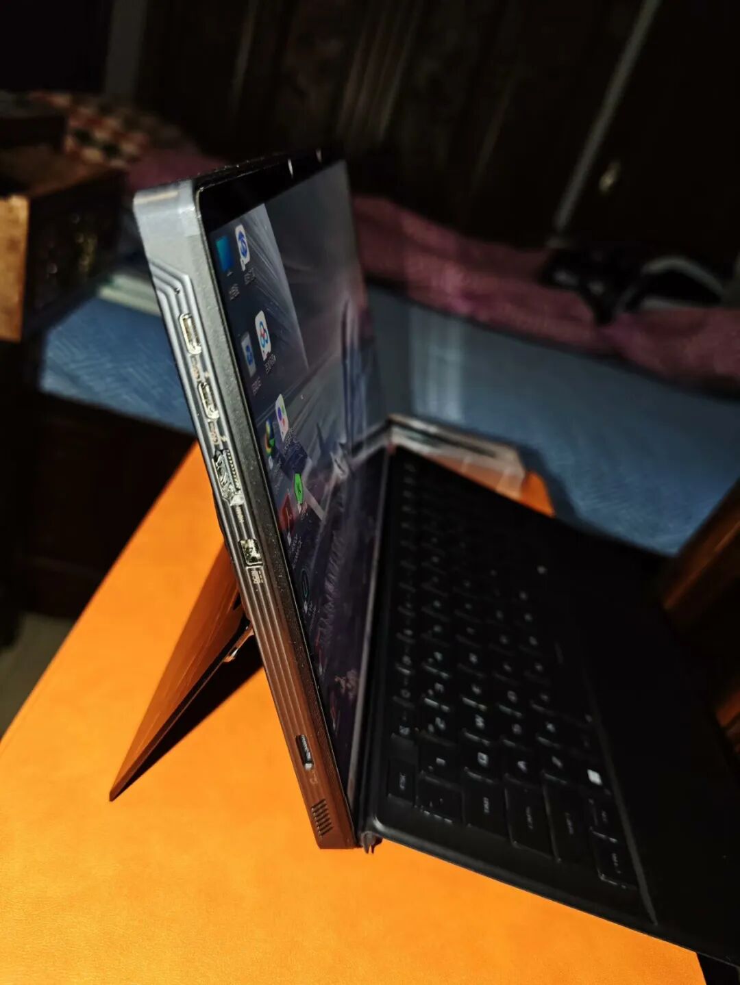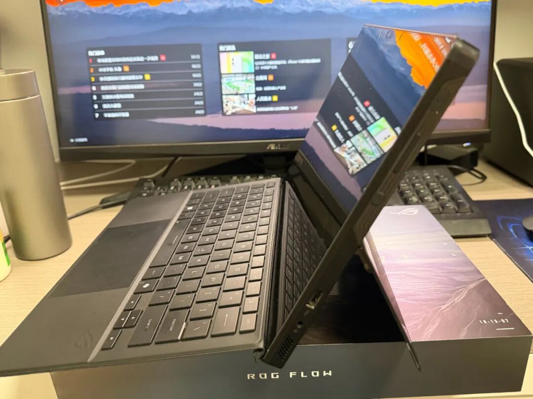 毕竟是ROG高端品牌产品,其设计和用料及做工方面不言而喻,整个机器采用CNC一体成型金属机身,重量约1.2kg,厚度1.3cm,支持170°无极悬停,可自由切换笔记本、平板或直立模式。有必要提一下的ROG的灯效的展示,全新的RGB透明视窗,也能带来更加炫酷的视觉效果。相比常规的二合一笔记本天生就更高级,所谓碾压感与生俱来。