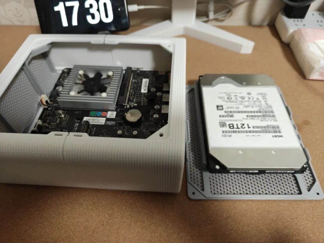 这款小主机无疑是后配机箱方案,典型的工控机主板,自行后配3D打印设计机箱的方案,机箱看着还是比较小巧,整机体积仅3L,但可以放下2个2.5寸硬盘和1块3.5寸硬盘,来自黄木匠开源的3D打印模型。而且经过修改以后,还支持一个2.5寸盘位,如此就是典型的,也是大部分用户想要的NAS三盘位小主机,可以说基本上满足大部分用户入门NAS需求了。