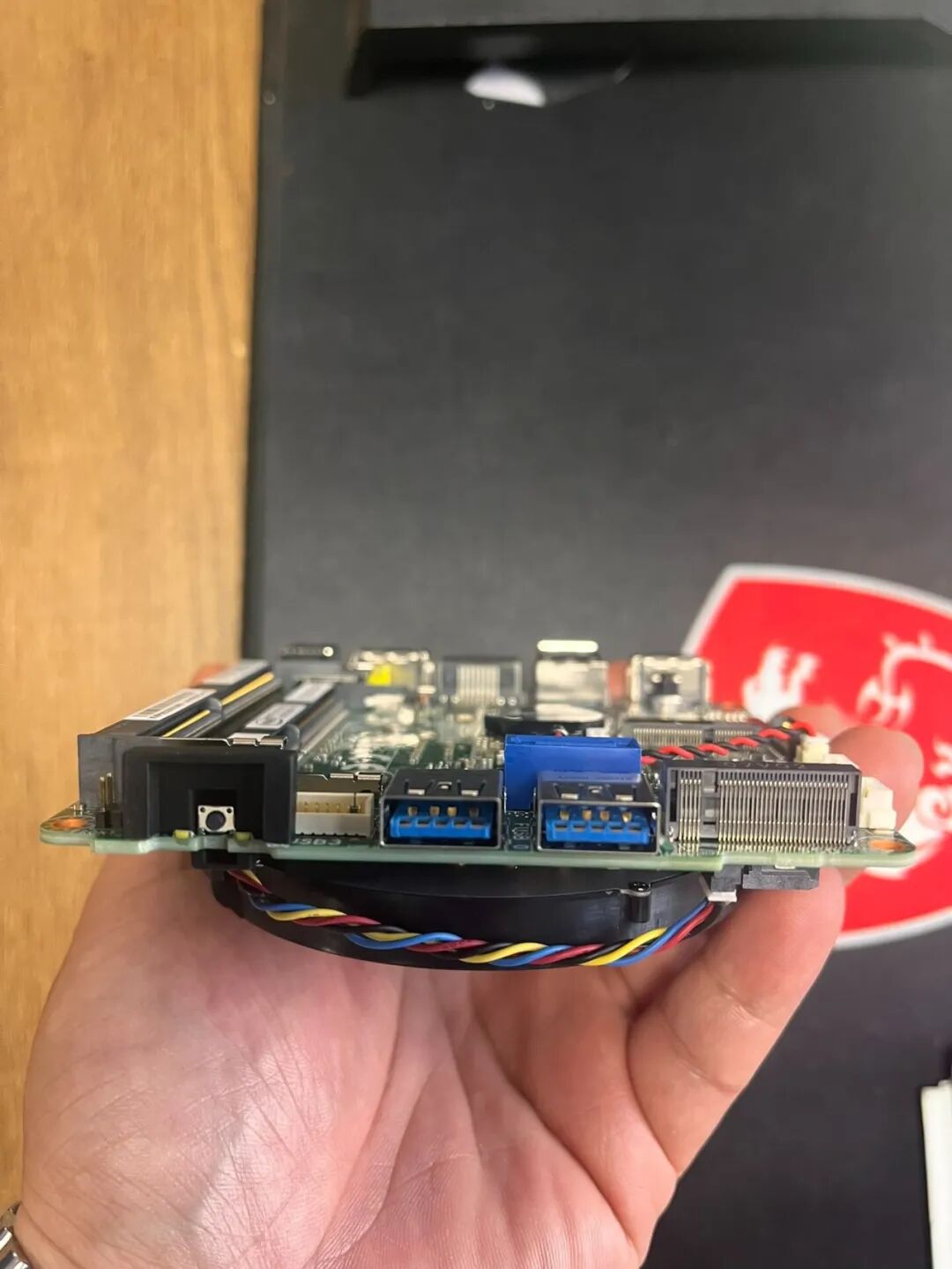 由于本身主板尺寸实在是过于小巧,所以板载的接口并不丰富,只能说是够用的典型而已。前置开机按键,2个USB3.0接口,仅此而已。后置接口设计相对更为丰富,包含有2个HDMI接口,1个USB3.0接口,1个USB2.0接口,1个雷电3接口,以及一个千兆网口。