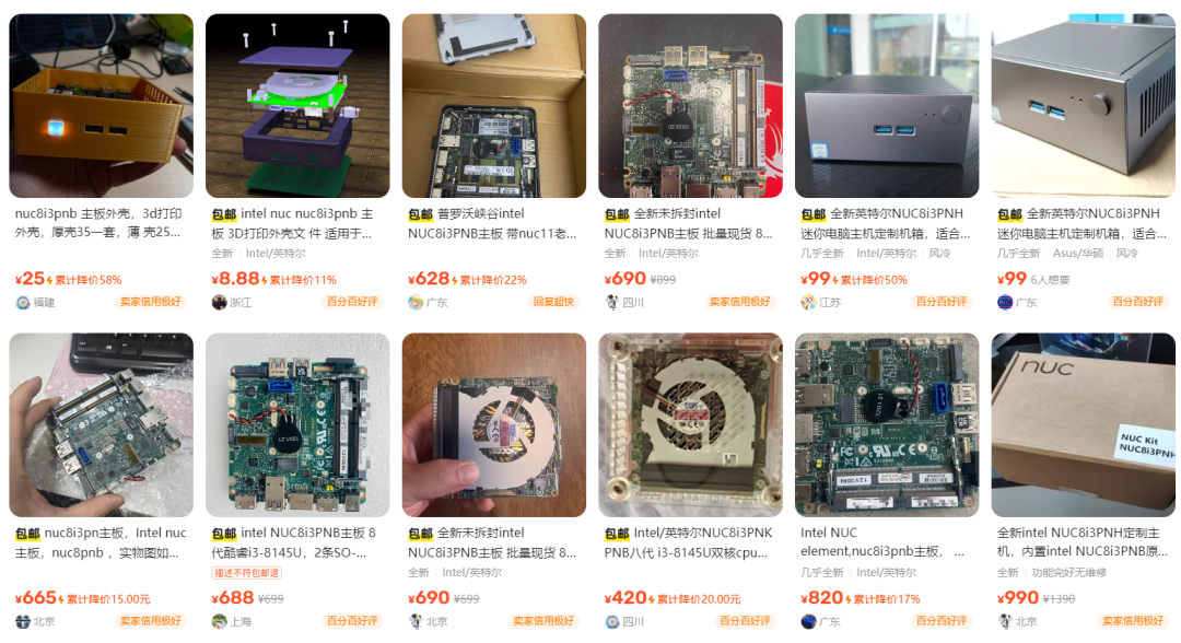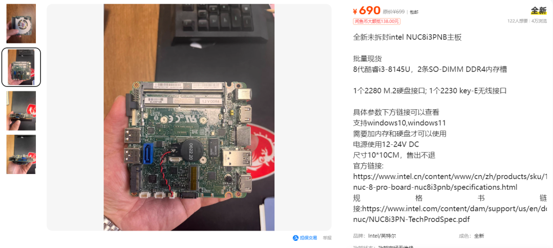 如今的电脑主机在朝着小巧化,迷你化,便携化的方向一去不复返,甚至AMD平台的小主机兼顾着高性能,游戏需求的方向发展,不过要说到具备代表性产品型号,那无疑还得是英特尔的NUC迷你主机,影响着后续一系列的小主机的设计和发展。想不到,这玩意儿竟然还有不少全新主板流出,真心不知道哪里的货源渠道,这不,有刷到咸鱼上大流出一款全新未拆封intel NUC8i3PNB主板,号称批量现货,妥妥的高溢价主板。