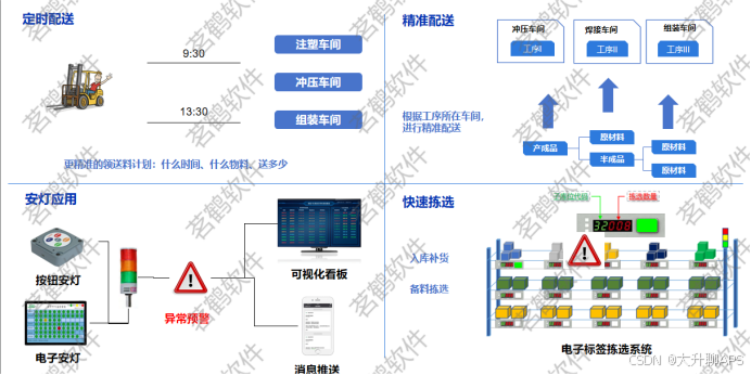 通过与生产线的联动,同时根据工程深度及物流时间,计算出上线配送的工位,通过自动产线采集,实现精准配送;通过多级物料拉动方式,实现物料的逐级准时化供给,并且支持面向订单的资源预警及过程管控,消除缺件及停线风险。