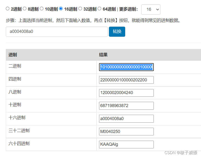 后面部分带有字母,初步预测和16进制有关。进制转换后发现,改为二进制时可得到和前面长度一样的一窜数字