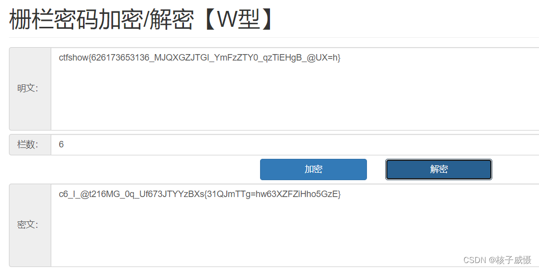 首先ctfshow肯定在最前面,栅栏密码,发现普通的栅栏密码整不出来,换成W型整出来了。