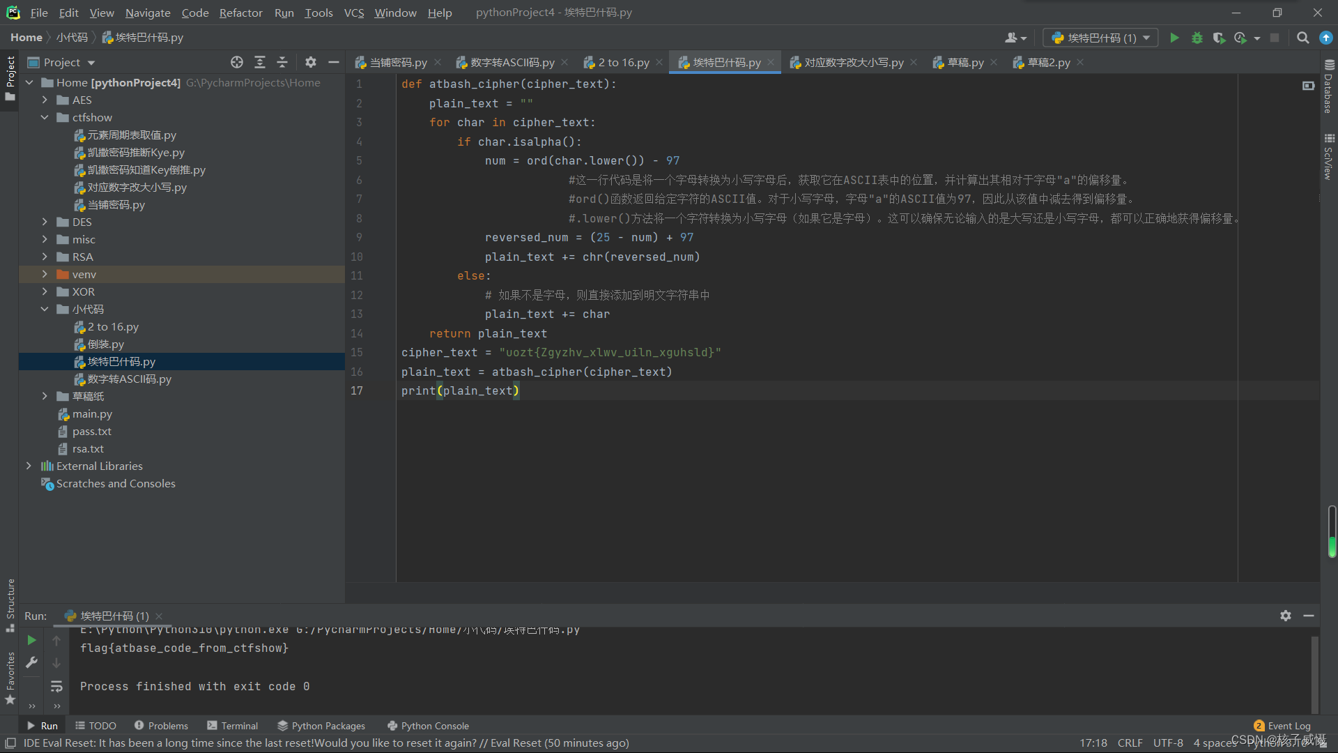 以为是凯撒密码,试不出来。怀疑是栅栏密码,也不行,W型也不对。查阅信息得知这里用到了埃特巴什码。用Python来实现解密。