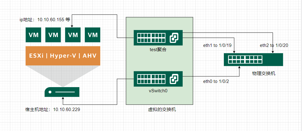 我们需要把esxi 上的三个网口配置成两个交换机,一个交换机绑定网口eth0,配置是宿主机管理地址,另外一个交换机绑定eth1,eth2 配置聚合端口,用于虚拟机网络。