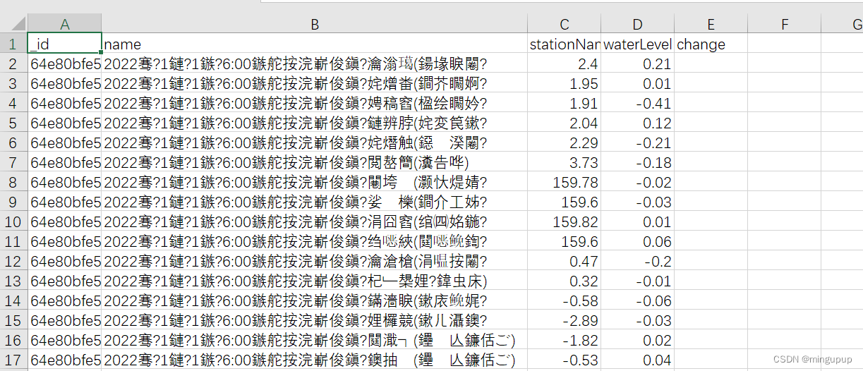打开导出的csv文件,发现中文是乱码的,如下图所示: