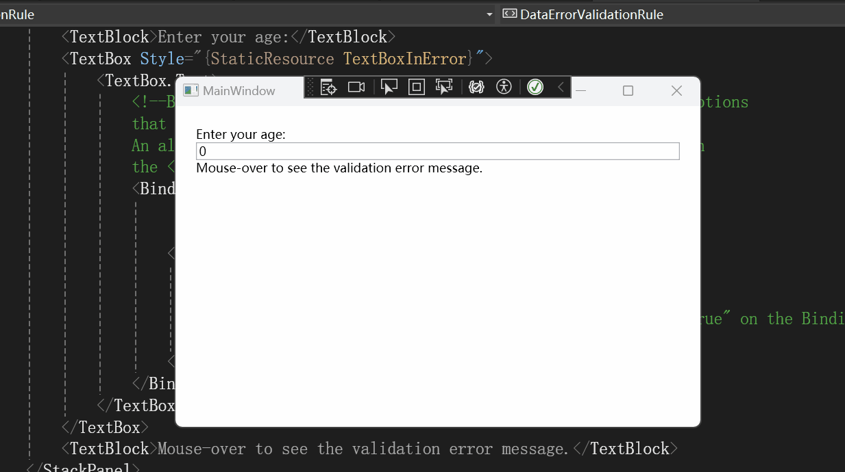 <TextBlock>Mouse-over to see the validation error message.</TextBlock>