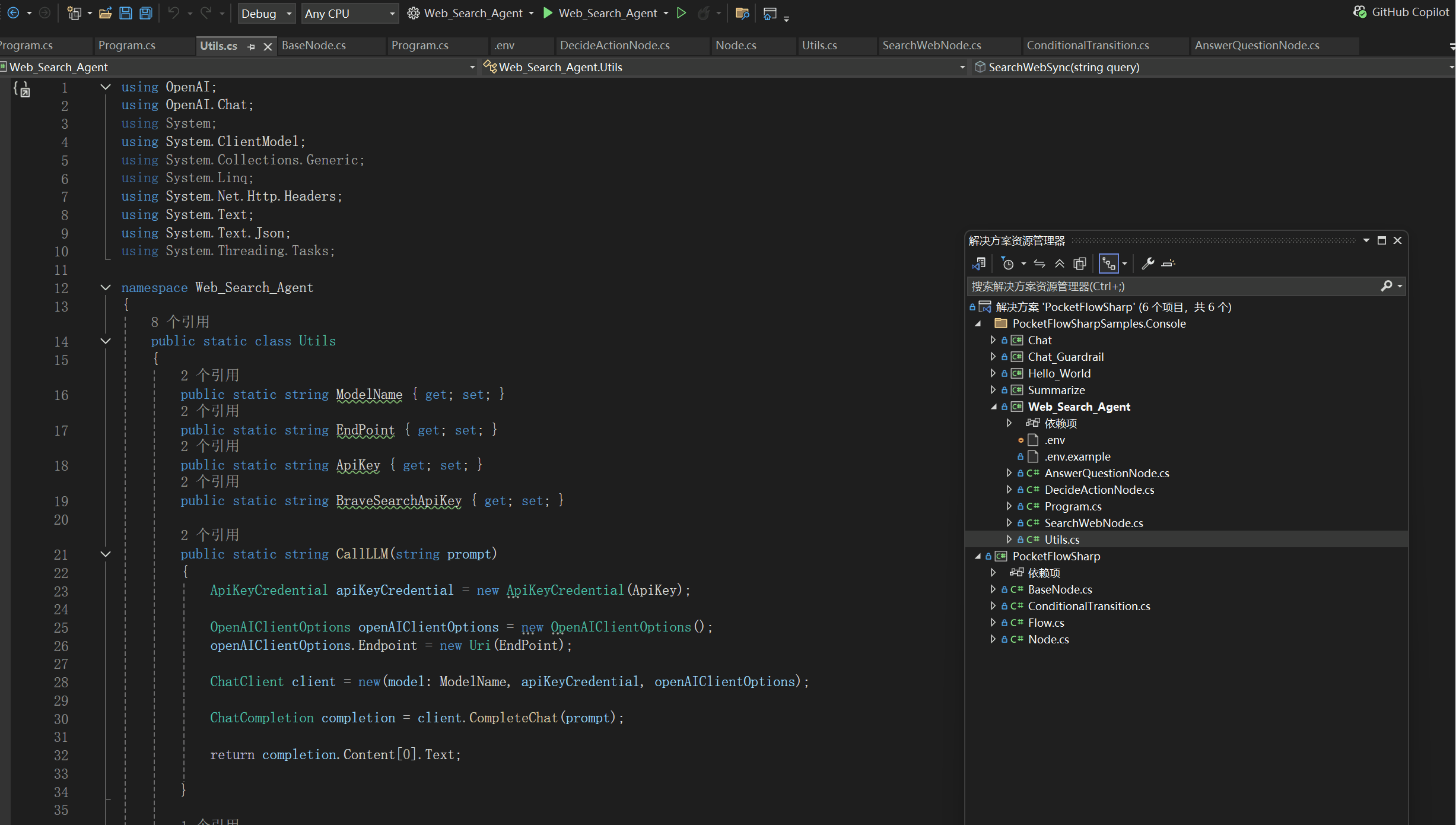 Web_Search_Agent说是Agent其实我觉得更像是个工作流。PocketFlowSharp相当于一个简单的流程框架,将节点根据一个string类型的action进行连接。