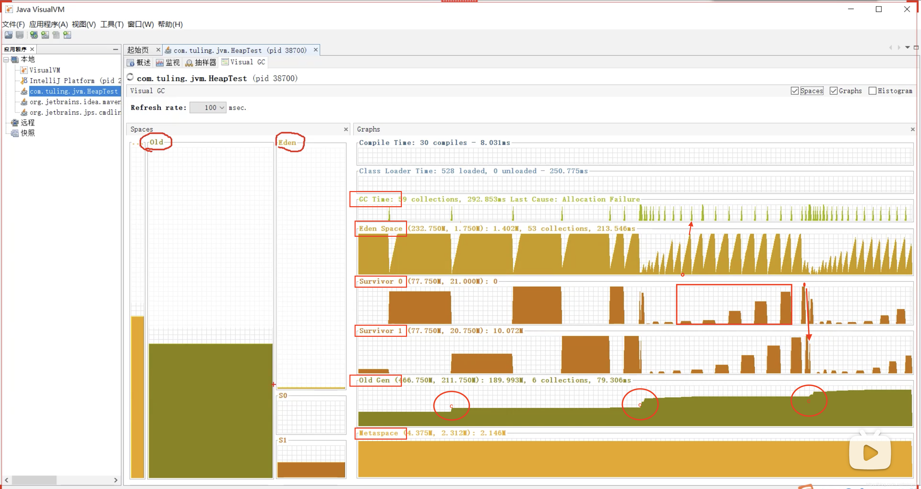1、Eden Space从0增长到最高处,代表EdenSpace区被对象占满,此时GCTime进行GC。此时Eden Space空从0开始。