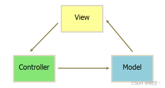 用户操作->View(负责接收用户的输入操作)->Controller(业务逻辑处理)->Model(数据持久化)->View(将结果反馈给View):