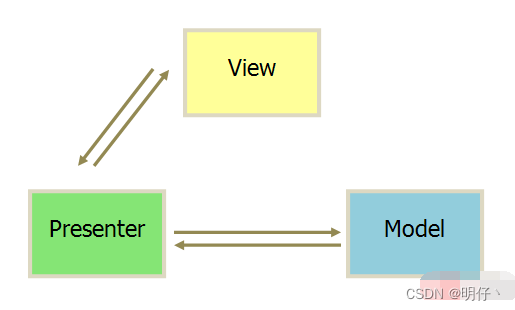 MVP是把MVC中的Controller换成了Presenter(呈现),目的就是为了完全切断View跟Model之间的联系,由Presenter充当桥梁,做到View-Model之间通信的完全隔离方向。