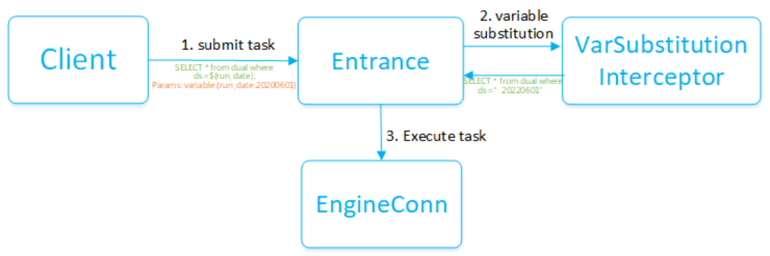 在Linkis任务执行过程中自定义变量在Entrance进行,主要通过Entrance在任务提交执行前的拦截器进行拦截替换实现,通过正则表达式获取到任务代码中使用到的变量和定义的变量,并通过任务传入的自定义变量初始值完成代码的替换,变成最终可以执行的代码。