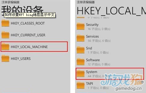 打开注册列表编辑器,进入HKEY_LOCAL_MACHINE/System/Maps/Providers/Tiles文件夹。我们将要对Ecnserver,MapTileUrl和Server这三个文件分别进行修改。