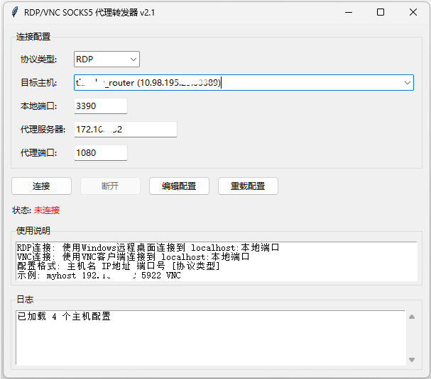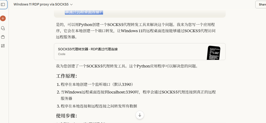 windows 11 需要连接远程服务器通过远程桌面连接。但是需要使用代理服务器172.121.5.204:1080 .而windows 11 远程桌面连接不支持配置socks5. 是否可以用python写一个应用 让windows 11 先连接172.121.5.204:1080 socks5, 然后手工用windows 11 连接远程服务器通过远程桌面连接?